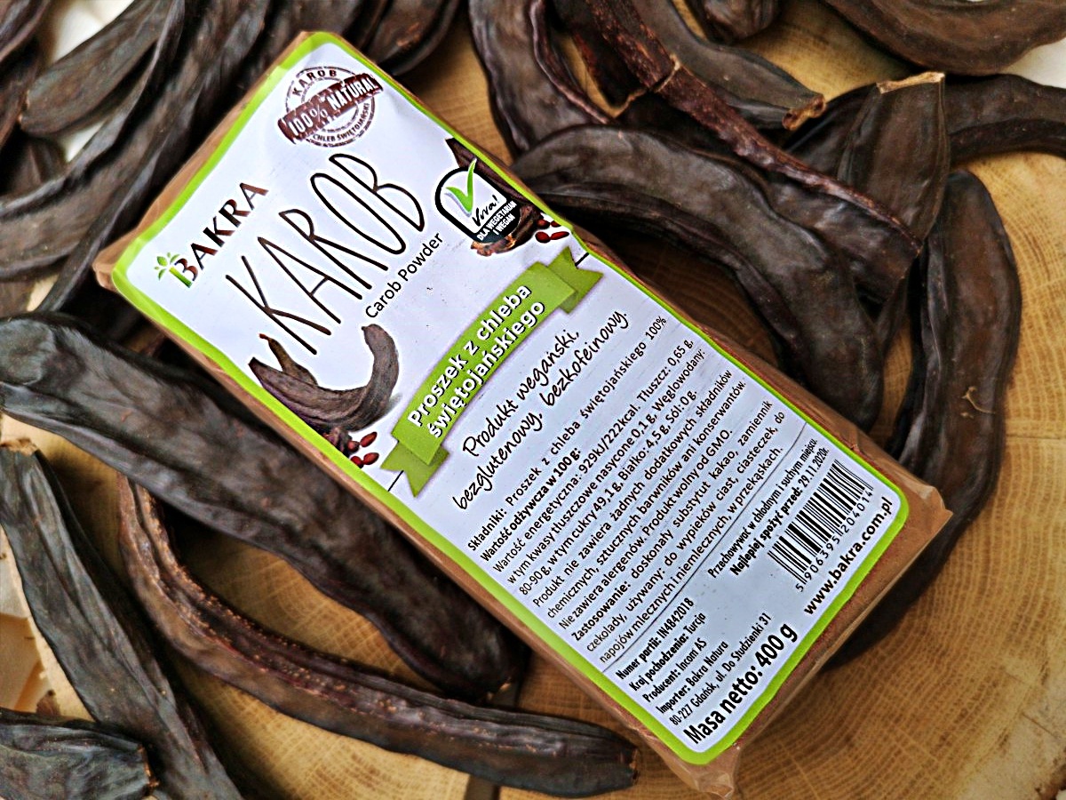 WŁAŚCIWOŚCI: zmielone na proszek strąki karobu, zawierają mnóstwo cennych składników np. potasu, wapnia, żelaza, fosforu, w smaku trochę przypomina kakao, dlatego sprawdzi się jako jego zamiennik dla alergików, jest naturalnie słodki, więc można dodawać go zarówno do napojów na ciepło i zimno, jak i do wszelkiego rodzaju deserów i wypieków