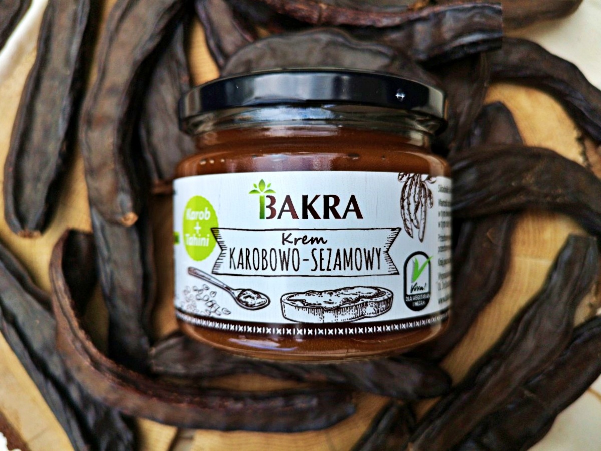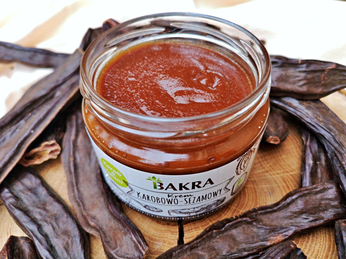 Bakra Krem karobowo-sezamowy. Bez zbędnych dodatków, zawiera tylko melasę z karobu i tahini. Do kanapek, naleśników, ciast i deserów.