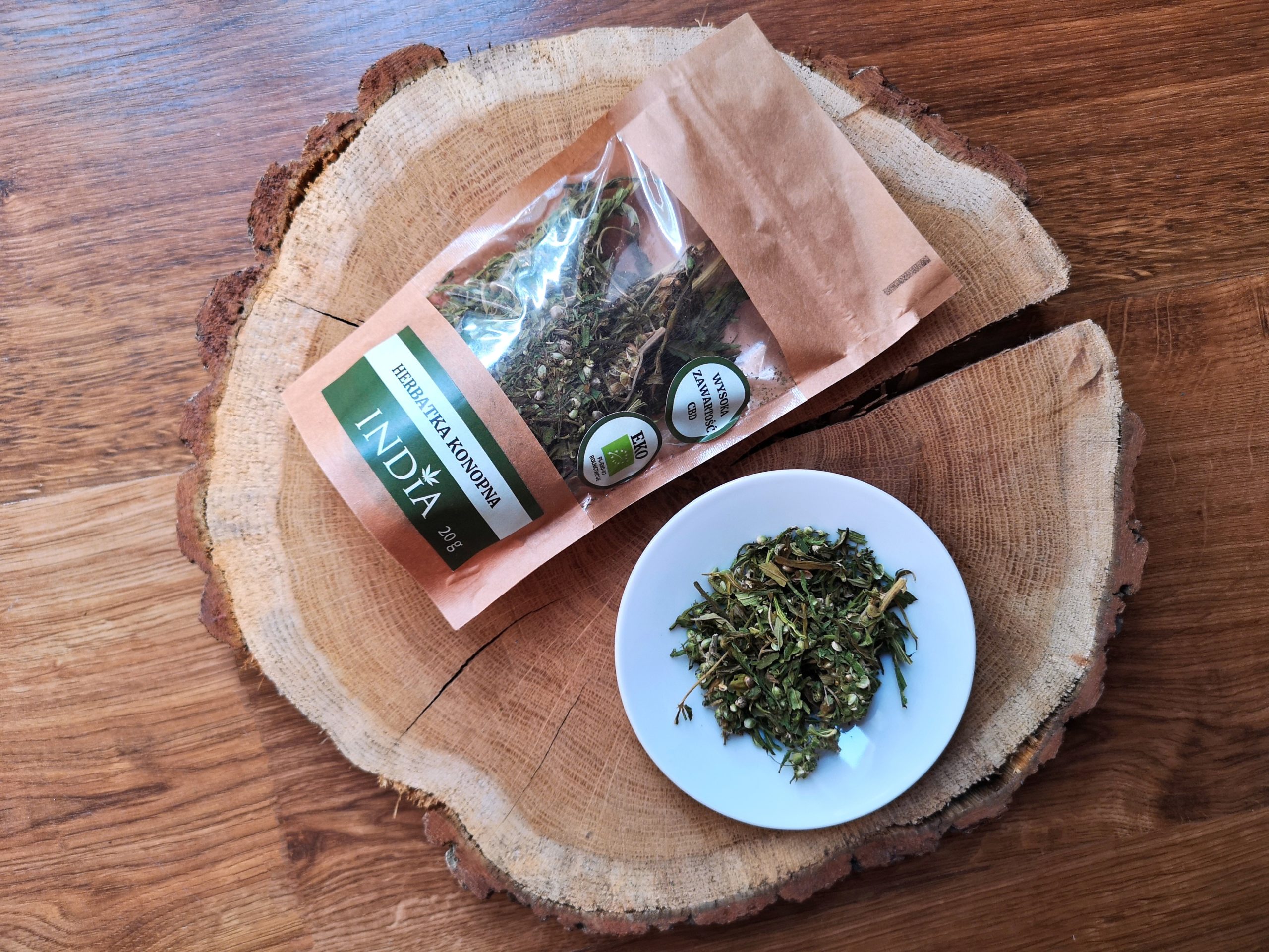 India Cosmetics Herbatka konopna to ręcznie zbierane i naturalnie suszone liście, kwiatostany i nasiona konopi włóknistych Cannabis sativa L. Zawiera poniżej 0,2% THC.