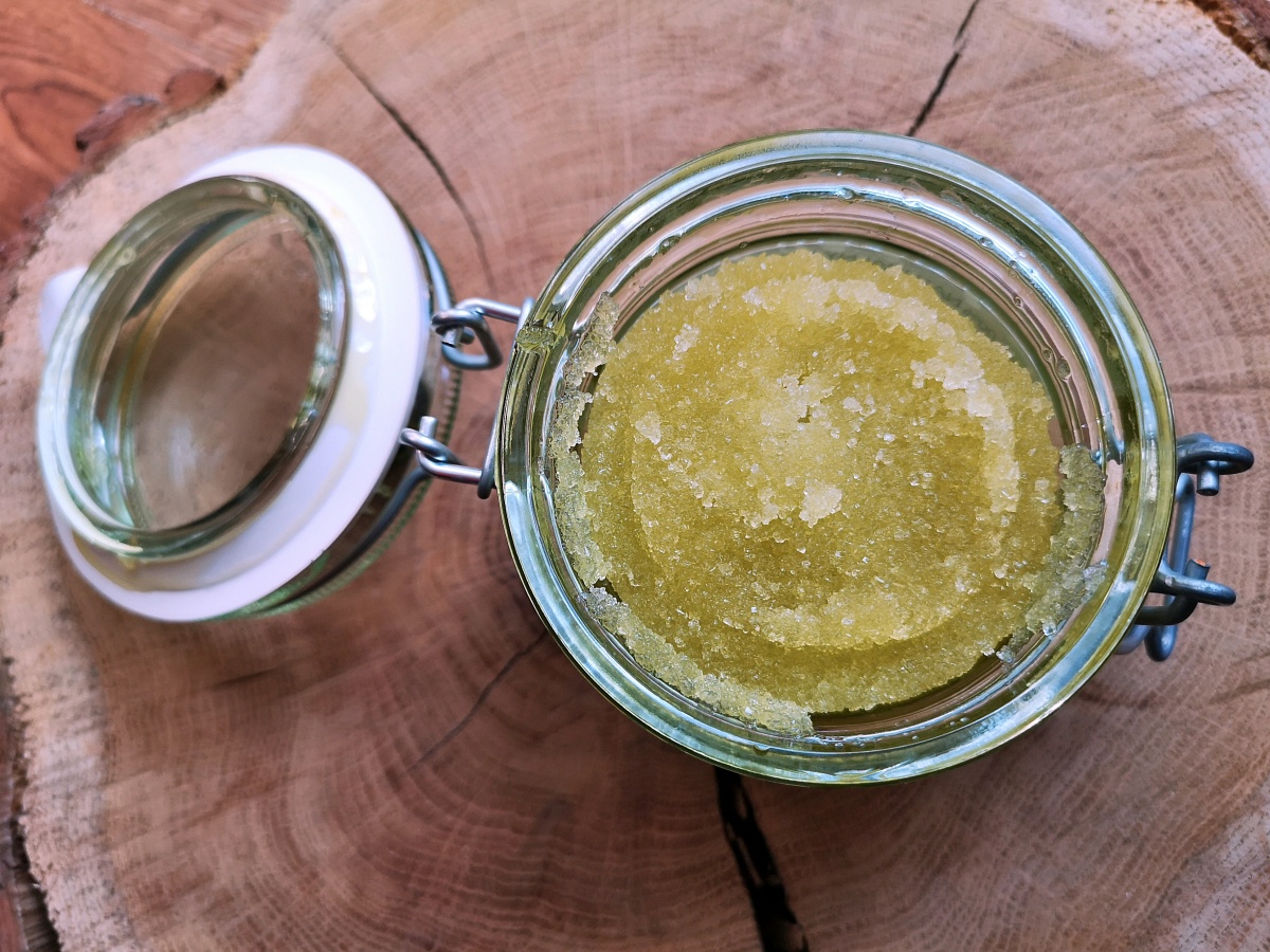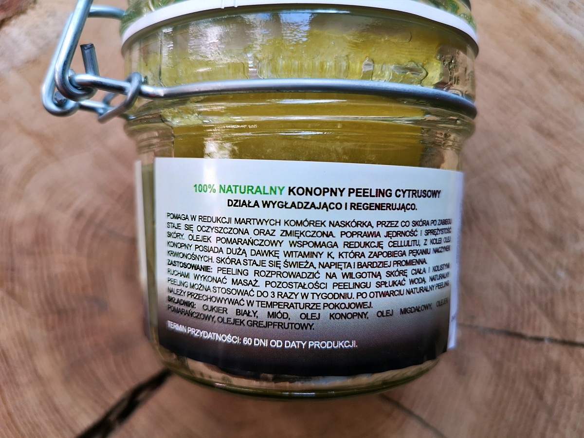 TŁUMACZENIE SKŁADU INCI: cukier biały, miód, olej konopny, olej migdałowy, olejek pomarańczowy, olejek grejpfrutowy